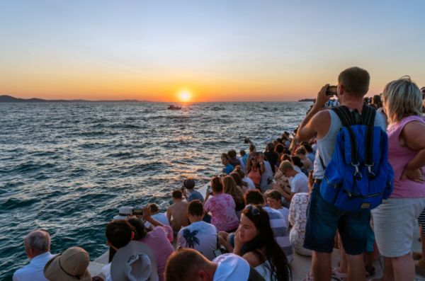 游客们聚集在克罗地亚的扎达尔观看日落。如今保持社交距离成了人们的共识,这种热门旅游景点人挤人的现象或将消失 | 图片来自《纽约时报》,摄影Sebastian Modak