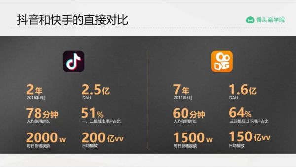 比如抖音和快手,抖音日活2.5个亿,快手1.6个亿。抖音在一二线城市的占比是51%,快手在三四线及以下城市的占比是64%。