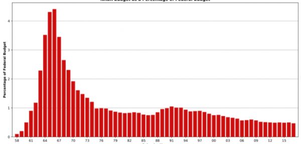 1958-2017年,NASA预算占美国整体财政预算比例,图表来自维基百科