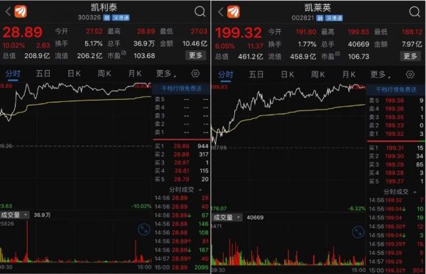 受此消息影响,今日凯利泰和凯莱英股价应声大涨。凯利泰开盘便迅速拉升,当天涨10%最终涨停,股价创出28.89元/股新高,总市值突破200亿元。同时,凯莱英也高开后震荡上行,截至下午四时,股价为199.32元/股,涨幅达6%,市值超460亿元。