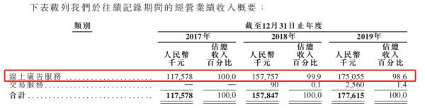 公司目前的业务分为线上广告和交易服务两块,其中收入的绝大部分来自于线上广告服务。据招股书显示,2017-2019年,公司的线上广告服务收入占比逐年下降,但2019年占比依然高达98.6%。