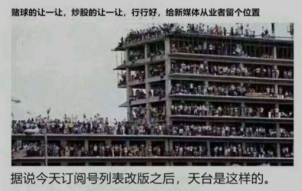 18 年 6 月 21 日,公众号将订阅号列表改成了信息流,当时很多新媒体从业者被“团结到了天台上”,以至于网上流传出了这样一张图: