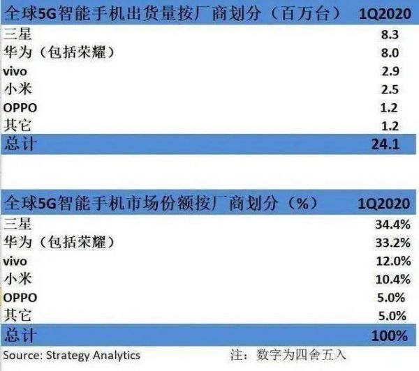 到了今年第一季度,排名则发生了一些变化。Strategy Analytics发布的最新报告称,全球5G智能手机需求一季度大涨,今年首季出货量超过去年的1870万台至2410万台,其中三星市占率达34.4%排名第一,华为则以33.2%的市场占有率排名第二。