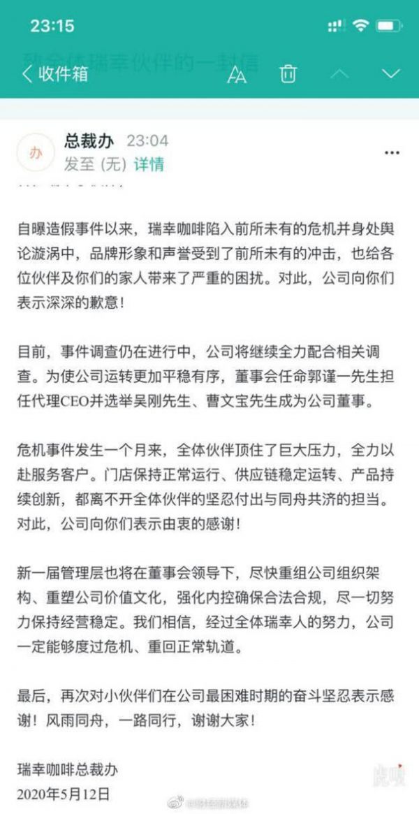 内部信称,因品牌形象和声誉受到影响,向员工致歉。新一届管理层将尽快重组公司架构,重塑企业文化,强化内控确保合法合规,保持经营稳定。
