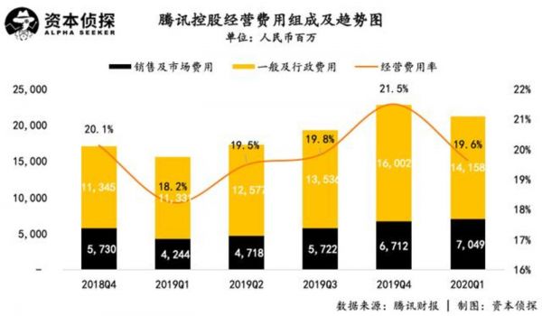 而在费用方面,腾讯本季度的销售及市场费用为70.49亿元,一般及行政费用为141.58亿元,整体经营费用率为19.6%,相比上一季度有所降低。