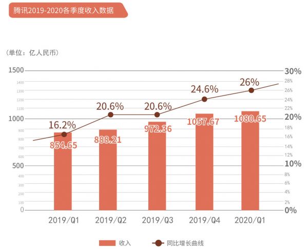通过横向对比腾讯2019—2020各季度营收数据,可以发现自发力产业互联网以来,腾讯一直保持着较快的营收增速。如图,2019年Q1营收同比增长16.2%至854.65亿元,2020年Q1营收同比增长26%至1080.65亿元。