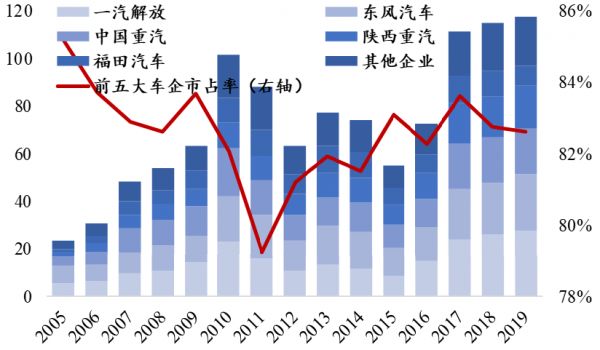 中国重卡市场中,一汽解放、东风汽车、中国重汽、陕西重汽、福田汽车长期保持在行业市占率前五,五大车企合计市场份额保持在80%以上。