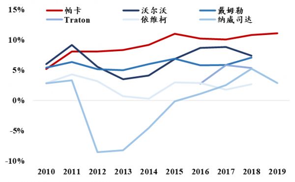 戴姆勒、帕卡、沃尔沃的营业利润率稳定在5%以上,其中帕卡持续保持在10%的水平,显著优于纳威司达、Traton、依维柯等车企。