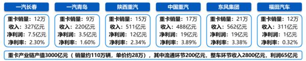 而中国五大重卡整车企业的营业利润率集中在2%至3%的区间,较北美市场的龙头整车企业还有较大差距。