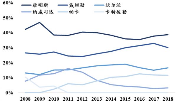 以全球最大的独立发动机制造商康明斯(Cummins)为例。2018年,康明斯在重卡发动机市场的市占率为39%,稳居行业第一。