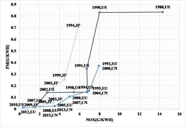 新的排放标准日趋严格,主要体现在对氮氧化物(NOX)和颗粒物(PM)排放限量要求更低,对卡车发动机的后处理系统提出越来越高的要求。
