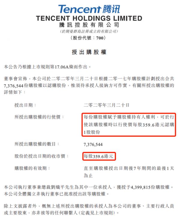 以腾讯控股为例,今年3月20号腾讯控股发布了两份期权授予的公告,其中一份公告披露了执行董事兼总裁刘炽平的期权授予情况。