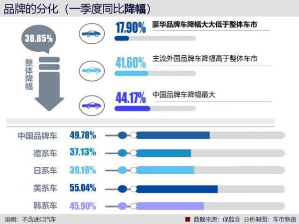 今年一季度,国内新车上险销量324.4万辆,同比减少39%。但是豪华品牌车销量依然坚挺,21.7%的同比降幅大大低于整体车市,如果剔除进口车,降幅更是只有17.9%了。而主流外国品牌和中国品牌的降幅都高于整体车市降幅。