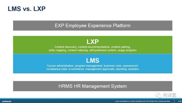 LMS更多是自上而下的学习管理、单一线性的学习规则与方案。LXP可以基于智能方法来推荐内容,而且还可以用于推荐第三方文章、查找专家,并可能为文档、视频和其他数字资产编制索引。从某种意义上说,LXP是内容管理、知识管理和学习系统三位一体的——这就是LXP市场增长如此迅速的原因。