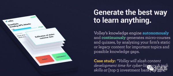 例如,Volley.com在华尔街被广泛使用,该公司的系统可以浏览网络安全文档,为银行“创建”培训、微观学习和安全程序评估。这种方法具有巨大的潜力,因为这些系统通过教学分析来确定内容的“专业水平”和“可信度”。
