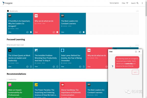 LinkedIn Learning在这方面有很多潜力,但像Filtered、Degreed和Valamis这样的公司也在努力实现这一点。例如,Degreed曾与美国银行(Bank of America)等客户合作,将特定的工作角色映射到学习建议中。IBM的YourLearning平台使用IBM的Watson人才框架来实现这一点。Filtered的产品Magpie,在您开始确保引擎了解您的角色、兴趣、学习需求和技能概要时,会问您许多问题。