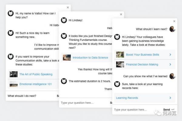 其中,对话界面是一种新的管理方式,请看Valamis的数字学习助手:
