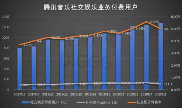 腾讯音乐社交娱乐及在线音乐的月活用户、付费用户、ARPPU、付费率,地歌网制图