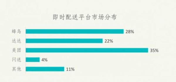 在达达的前头,有两个强大的竞争对手占据了老大和老二的位置,那就是美团和蜂鸟。美团的市场占比最高,有35%,蜂鸟紧跟其后,为28%,达达的市场占比为22%左右。三者的市场份额相差并不远,并没有不可逾越的护城河。