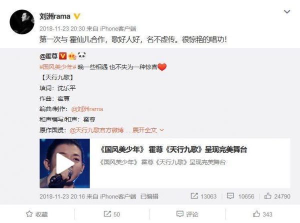 这个“包装”尽管无法被部分同行认可,但却足以让刘洲在圈内赚足存在感,成为各大音乐综艺的“座上宾”。在他的个人微博上,几乎全是和当今知名歌手的互动。
