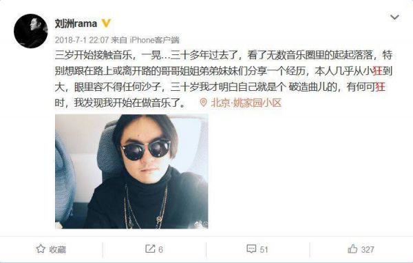 2018年7月1日,音乐制作人刘洲在个人微博上这样写道,并配了一张带着墨镜的自拍图。