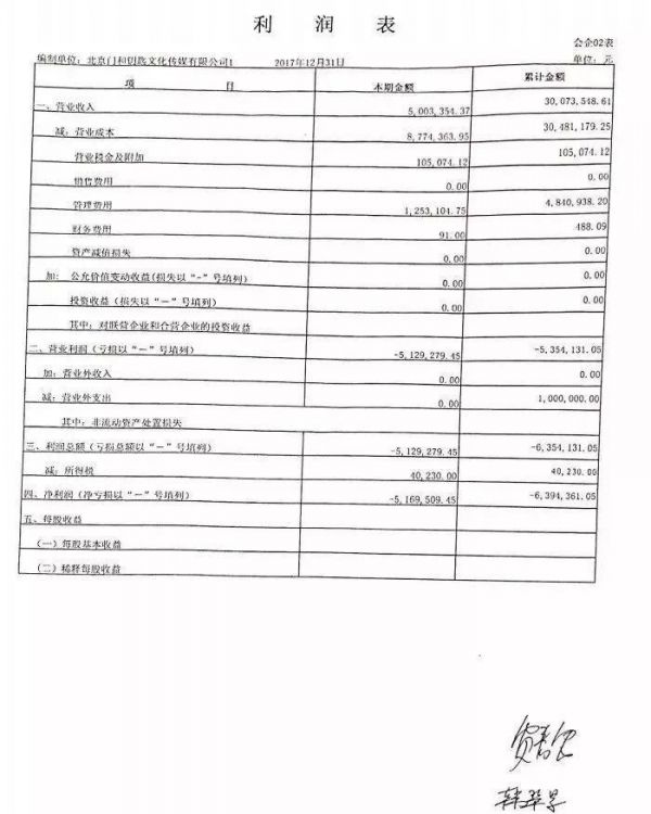 诡异的是,在“门和钥匙”出具的财务报表上,截止2017年12月31日,“门和钥匙”累计收入为3000余万元,而营业利润一栏则显示为-535万,公司净利润为-639万。