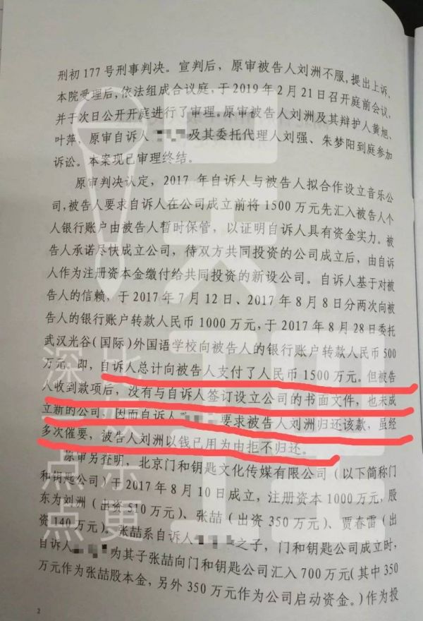 在“娱理”公布的案件裁定书上显示,刘洲收到1500万后,没有与张建华签订设立公司的书面文件,也没成立新的公司。即使张建华多次上门想把钱要回来,刘洲都以钱已经用了为理由,拒绝归还。