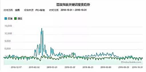 2018年至2019年百度全年搜索指数显示,民宿关键词搜索指数除在春节前后出现极大波动外,总体保持稳定,民宿搜索的日均值3674次,酒店是2758次,民宿是酒店的113%倍,这意味着民宿产品正代替酒店成为住宿选择。