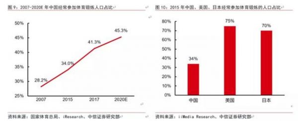 一方面是体育人口比例的增加。中国现在的体育人口比例已经达到了40%多,但和发达国家相比,其实还有很大的差距,欧美基本上已经达到了60% -70%多的水平。