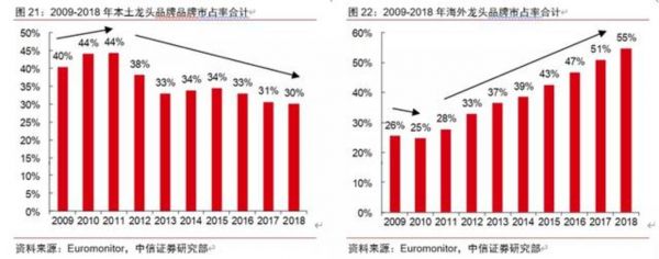 反而是海外的龙头品牌,在中国的渠道越来越下沉,并且有越来越多的国际品牌进入到中国市场。所以从2010年开始,一直到2018年,都是海外龙头品牌的市场份额在急剧提升的过程。