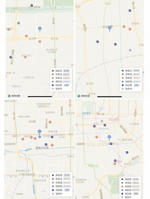 界面新闻以北京德胜门、永安里、肖村桥、丰台北路4个分布于北京不同方位的地名定位,发现瑞划算(M)机器已经被纳入定位系统,此外,小鹿茶的新开门店也同样被显示在瑞幸APP或者小程序中,因此瑞幸咖啡的新开门店数字里,很可能也包括了无人售货机、无人咖啡机以及小鹿茶门店。