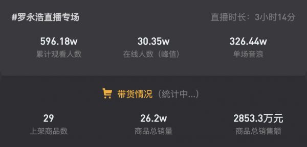 像老罗直播,第一场单场千万累计观看,到第六场虽然仍然有抖音加持,粉丝总量也到达了1000万以上,但累计观看只剩下不到600万,同时在线峰值只剩下30万——这还是在老罗自带话题性,反复因为“翻车”登上微博热搜的基础上,可见流量复用艰难。