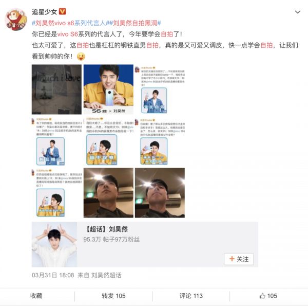 喜茶这个还算是应势造梗,产品发布类的营销活动,就更需要品牌自发进行精细化的运营策划了。比如说vivo S6在发布前,就利用了代言人刘昊然“自拍黑洞”的外号,再与娱乐类别的大号联动,提前埋梗;等到直播发布会当中,品牌再连线刘昊然用新品自拍“交作业”,一下子就突出了产品“自拍神器”的标签。