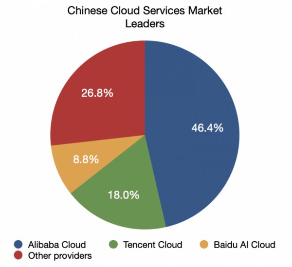 整体而言,中国的云服务市场潜力巨大。研究公司 Canalys 的数据表明,2019年第四季度,中国云基础市场同比增长66.9%。在中国国内,阿里云最大的的竞争对手腾讯云和百度云分别占有18.0%和8.8%的市场份额。