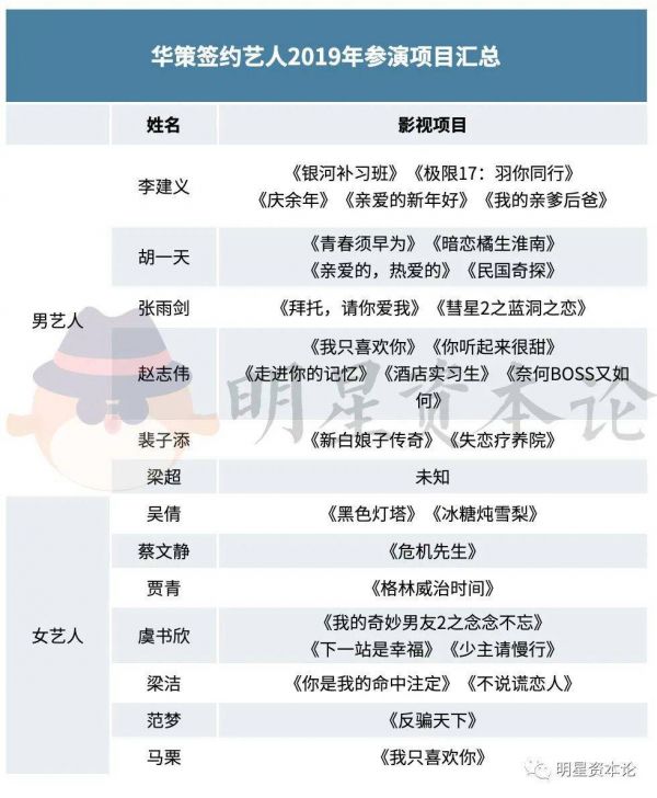 曾经重度依赖头部知名演员的华谊兄弟也从2018年至今持续在尝试打造偶像的可能性。华谊兄弟旗下的两家子公司华谊兄弟聚星和华谊兄弟时尚先后向爱奇艺、腾讯的多档偶像节目输送了艺人。在2019年的财报中,华谊也透露除了重点引进知名艺人外,还将培养和储备较大发展潜质的新艺人。足以可见公司丰富艺人梯队的急迫感。