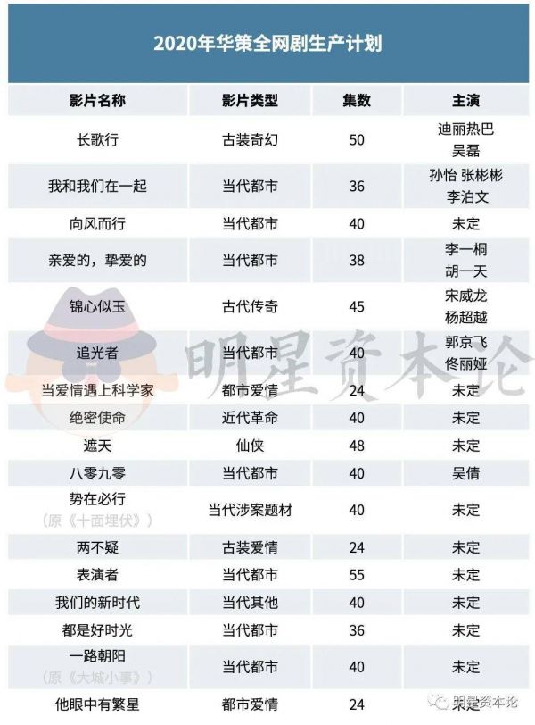 以华策为例。在其2019年财报中公布了2020年全网剧的生产计划,今年华策计划制作17部全网剧,涉及古装奇幻、古代传奇、当代都市、都市爱情等多种题材,其中《长歌行》《遮天》《两不疑》等都是知名IP,有众多原著粉丝的支持。在这一众片单中,华策的艺人却鲜有参演。目前确定的只有胡一天参演《亲爱的,致爱的》,吴倩参演《八零九零》。
