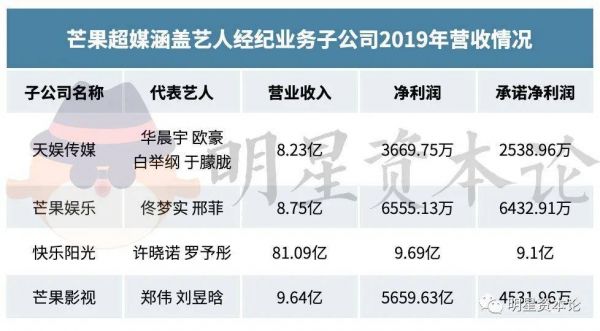 经历重大资产重组后的芒果超媒则并购了一系列芒果系子公司。其中,涵盖艺人经纪业务的就包括天娱传媒、芒果娱乐、快乐阳光、芒果影视四家。报告期内,这四家公司也全部完成了与集团的业绩对赌。
