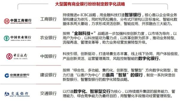 相对于平安的先知先觉,国内其他金融机构也感受到了科技的力量,但真正纳入战略确是2018年前后了。到2018年,国有大型商业银行纷纷将数字化置于战略之首,全局发力,力求将数字化基因融入血脉,以期行在当下、赢在未来。