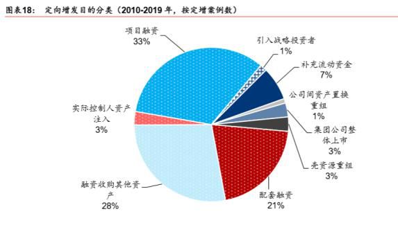 有数据显示,2010-2019年期间,按增发目的划分,33%出于项目融资目的而进行定向增发,28%为了融资收购其他资产,21%为配套融资,3%为壳资源重组,集团公司整体上市,补充流动资金等。其中为项目融资的折价率多在0%至40%之间。