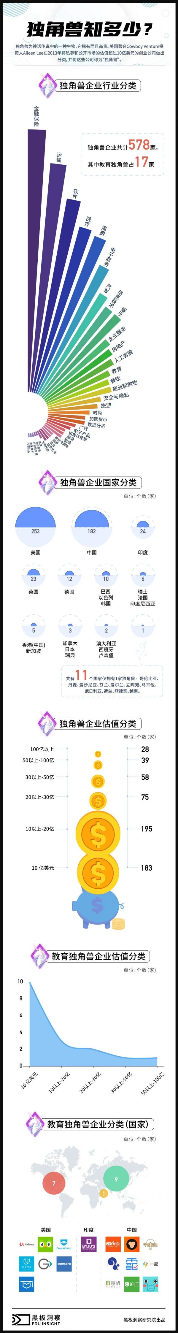 到目前为止,全球已经有了578家独角兽企业,其中教育企业独角兽占17家,国内包括9家,海外教育独角兽包括8家。