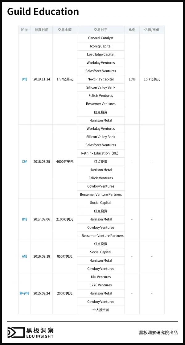 Guild Education为成人在职提供课程,课程和学位,为他们的教育和职业发展提供了一条道路。Guild从头到尾为这些成年人提供支持,和非营利性的大学机构合作,为企业提供员工的各种各样主题的课程培训和相应的证书,这些课程涵盖范围从高中课程、职业教育课程到大学学士课程和硕士课程都包含在内。