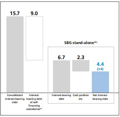 2019财年末,软银集团资产负债率72.8%。截至2020年5月9日,软银集团合并有息负债15.7万亿日元,其中软银集团层面的总有息负债6.7万亿日元,净有息负债4.4万亿日元。