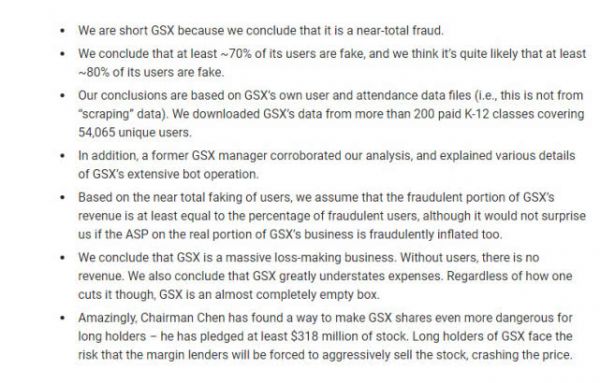 3、浑水认为,GSX存在巨大亏损。没有用户,就没有收入。我们还得出结论,GSX大大低估了费用。不管怎么切,GSX几乎是一个空盒子。