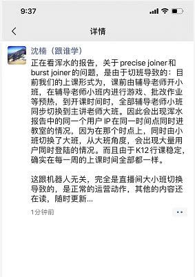 对于浑水质疑跟谁学80%的用户是机器人的问题,跟谁学CFO沈楠在朋友圈回复:“关于precise joiner和burst joiner的问题,是由于切班导致的:目前我们的上课形式为,课前由辅导老师开小班,在辅导老师小班内进行游戏、批改作业等预热,到开课时间时,全部辅导老师小班同步切换到主讲老师大班。因此会出现浑水报告中的同一个用户IP在同一时间点同时进教室的情况,因为在那个时点上,同时由小班切换了大班,从大班角度,会出现大量用户同时登陆的情况。而且由于K12行课稳定,确实在每一周的上课时间全部都一样。”