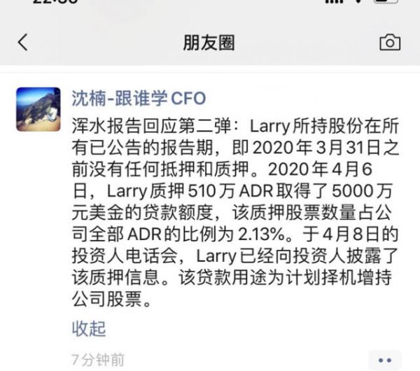 对于浑水质疑的陈向东股票质押情况,沈楠在朋友圈回应:“Larry(陈向东)所持股份在所有已公告的报告期,即2020年3月31日之前没有任何抵押和质押。2020年4月6日,Larry质押510万ADR取得了5000万元美金的贷款额度,该质押股票数量占公司全部ADR的比例为2.13%。于4月8日的投资人电话会,Larry已经向投资人披露了该质押信息。该贷款用途为计划择机增持公司股票。”