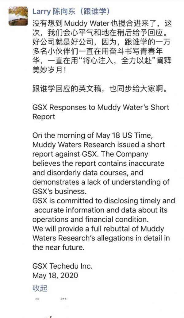 对此,跟谁学董事长兼CEO陈向东在朋友圈表示,“没有想到Muddy Water也搅合进来了,这次,我们会心平气和地在稍后给予回应。”