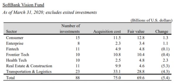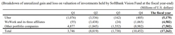 正如孙正义在业绩会上所说,新冠疫情对其所投资的旗下项目估值影响巨大,2020财年第四季度(2020年第一季度),其除Uber和WeWork外的投资资产估值下滑89.8亿美元。