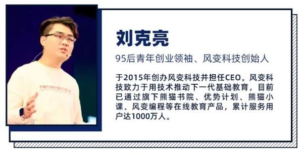 *创始人简介: 刘克亮,95后青年创业领袖,于2015年创办风变科技并担任CEO。风变科技致力于用技术推动下一代基础教育,目前已通过旗下熊猫书院、优势计划、熊猫小课、风变编程等在线教育产品,累计服务用户达1000万人。2017年,刘克亮获得深圳市创业创客资助,2019年9月,入选“2019胡润Under30s创业领袖”,同年10月,入选2019福布斯中国30位30岁以下精英榜。