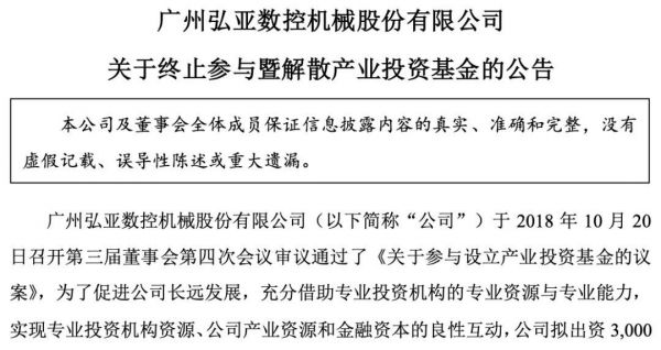 因为募资失败,第一批基金已经悄悄倒下。3月10日,广州弘亚数控机械股份有限公司发布一则《关于终止参与暨解散产业投资基金的公告》,公司拟出资3000万元人民币作为有限合伙人与多家知名VC/PE机构共同出资设立的一只产业基金,正式宣告解散。