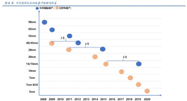 相较于全球晶圆代工龙头台积电的制程收入占比来看,中芯国际仍然存在2-3代技术差距。但是14nm是长节点技术,从台积电技术制程收入结构来看,自2014年三季度量产至2019年,16nm技术制程占台积电收入比重始终在20%以上。